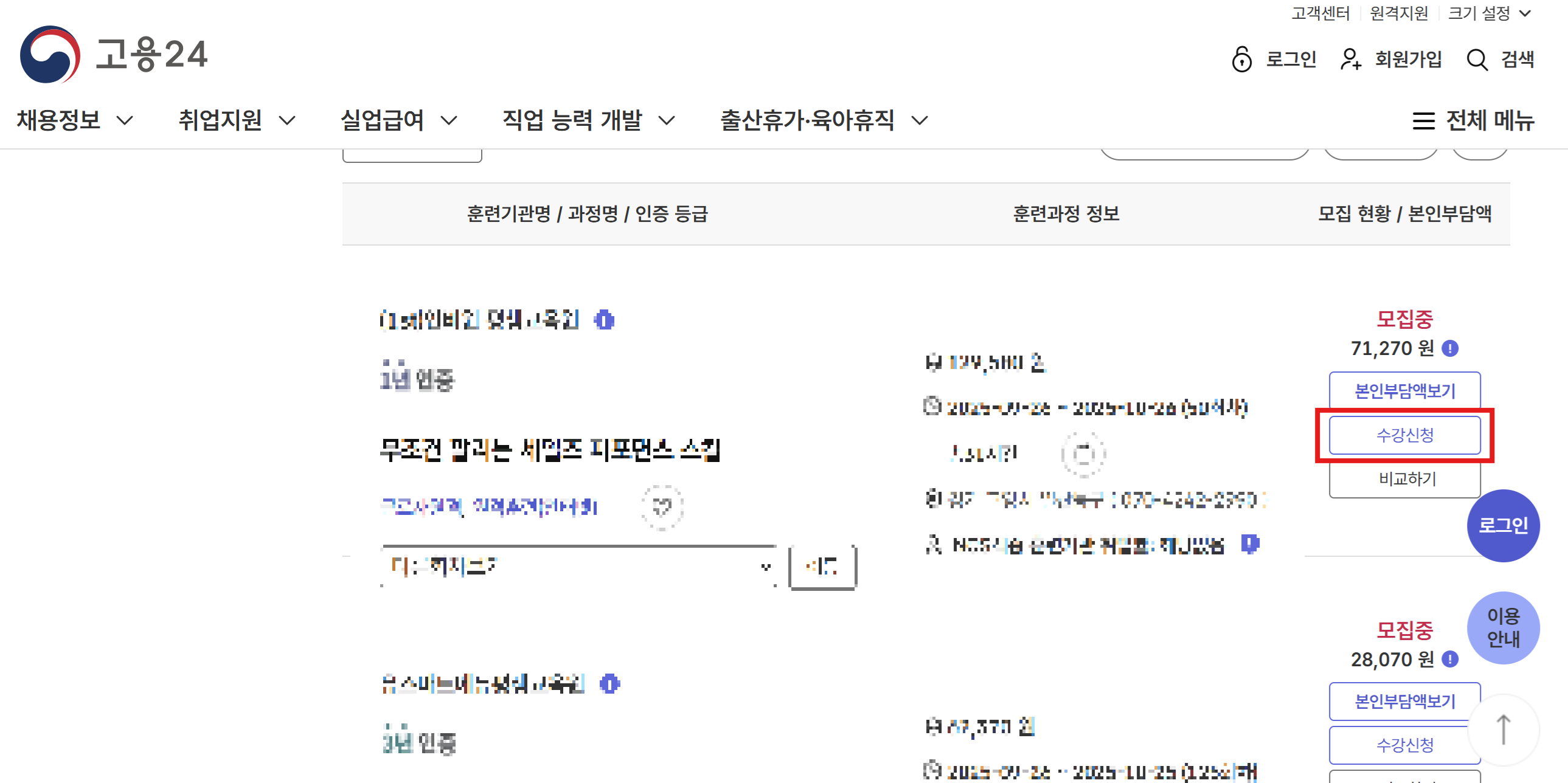 - 고용24 홈페이지에서 원하는 훈련 과정 검색 및 신청
